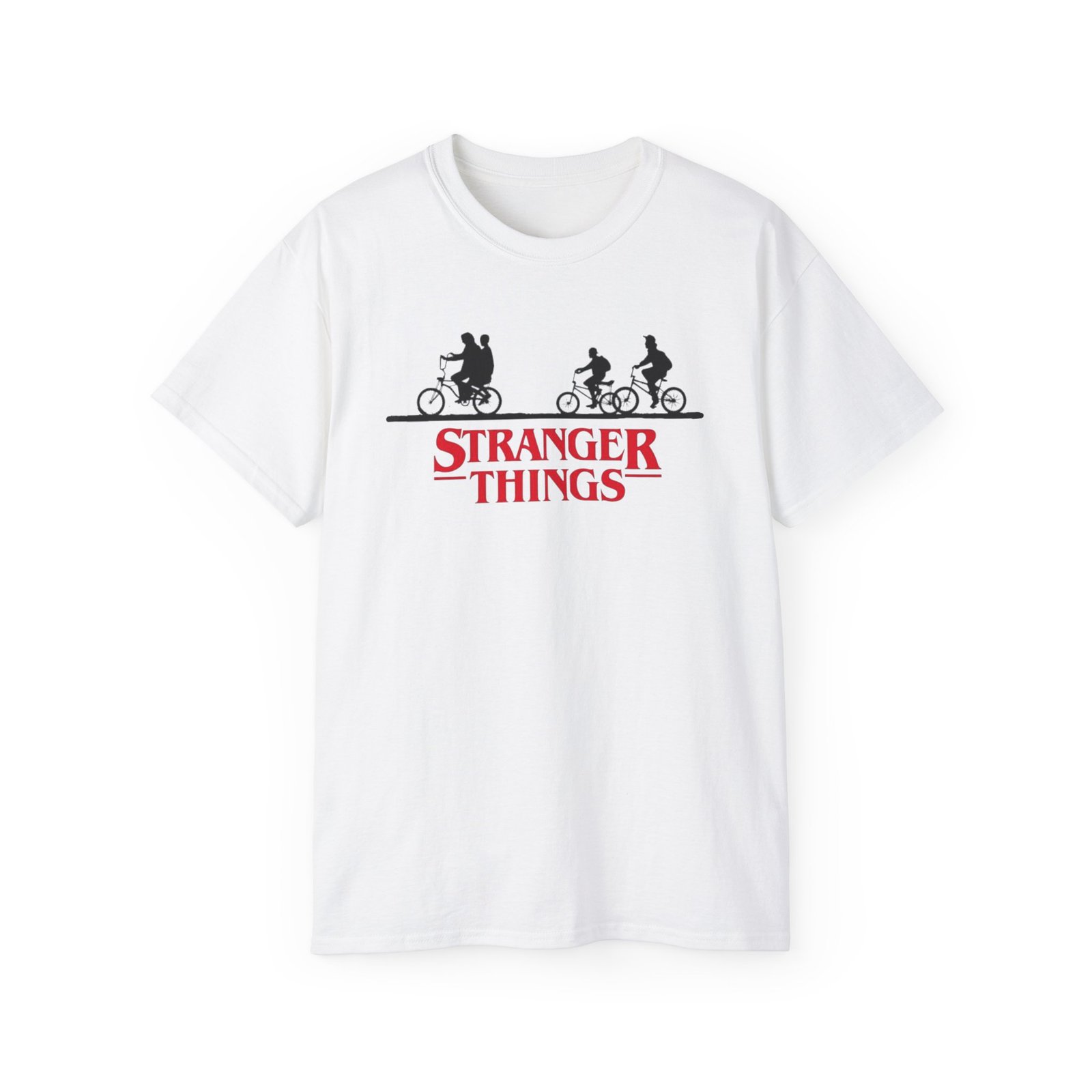 Step into the world of Hawkins with this Stranger Things Graphic Tee. Featuring the iconic red logo and bike crew silhouette, this shirt is a must-have for fans of the hit Netflix series.
